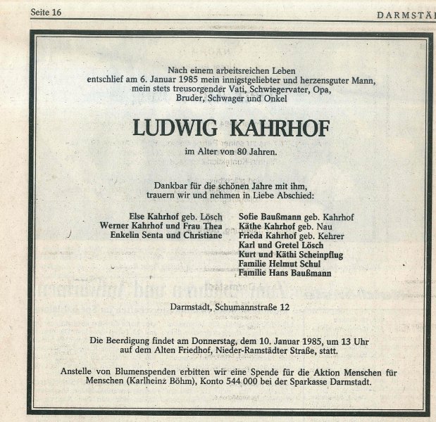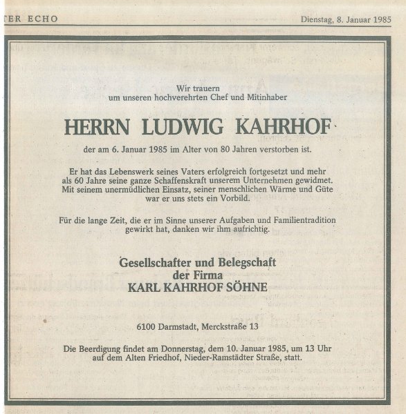 Anforderungen seines Berufs: ständige Dienstbereitschaft, Einfühlungsvermögen und menschliches Verständnis. Am 6. Januar 1985 ist Ludwig Kahrhof, der geschäftsführende Gesellschafter des Darmstädter Bestattungsunternehmens Karl Kahrhof und Söhne KG, mit achtzig Jahren gestorben. Mehr als 60 Jahre hat er unermüdlich mit Takt und Bescheidenheit dem Unternehmen gedient. Heute wird das Unternehmen von seinem einzigen Sohn Werner Kahrhof und dessen Tochter Senta Kahrhof weitergeführt.
